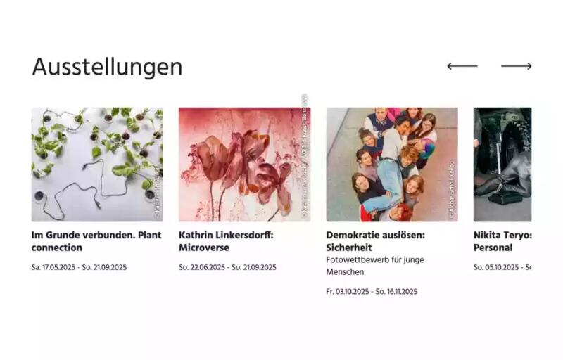 Das Veranstaltungsprogramm wird durch einen digitalen Kalender ergänzt, der Ausstellungen, Spezialformate und Events tagesaktuell abbildet. Frühere Ausstellungen bleiben im Archiv einsehbar und machen das kulturelle Profil des Hauses langfristig erlebbar.