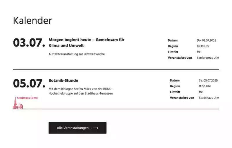 Die Website des Stadthauses Ulm basiert auf Craft CMS – einem leistungsstarken Content-Management-System, das besonders durch seine freie Strukturierung von Inhalten überzeugt. Redakteur:innen können Inhalte exakt so anlegen, wie sie gebraucht werden – ohne starre Vorlagen oder Einschränkungen im Seitenaufbau.