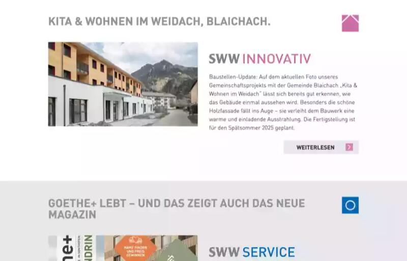 Das Sozial-Wirtschafts-Werk des Landkreises Oberallgäu (Wohnungsbau) betreibt mit sww-oa.de eine zentrale Anlaufstelle für wohnungssuchende Bürger:innen der Region. Die Website wurde von seitenblick technisch realisiert – basierend auf TYPO3. Während das Design extern geliefert wurde, übernahmen wir die Konzeption und vollständige Umsetzung des Projekts.